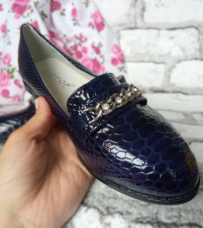Класичні туфульки, лофери синього кольору. Виготовлені із лакованого шкірзаму. Принт пітон. Ортопедична устілка. М'який замш у середині. Невеличкий каблучок. Прикрашені ланцюжком з камінцями. Виміри устілки проводились повність, враховуйте, що носик у туфлях загострений. Розміри та заміри устілки (повністю) Трохи маломірять Розмір 30 - 19,5 см Розмір 31- 20см Розмір 32 - 20,5 см Розмір 33 - 21 см Розмір 34- 21, 5см Розмір 35 - 22 см Розмір 36 - 22,5 Розмір 37 - 23см Зверніть увагу, можлива невелика похибка враховуючи проведення замірів вручну та неточностей сантиметрових стрічок. Радимо вибирати розмір взуття з запасом. Пишіть, з радістю відповімо на всі запитання, що Вас цікавлять.