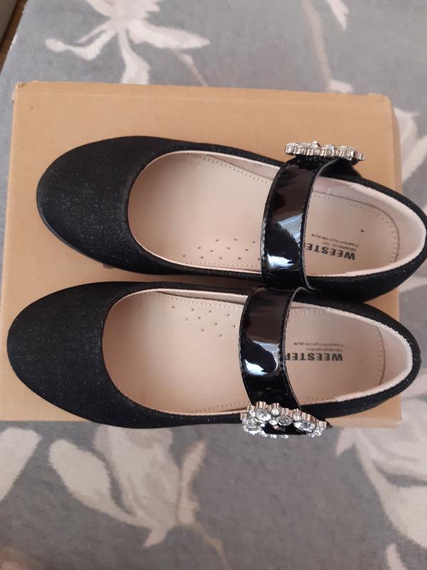 Туфлі нарядні. 29 розмір. Втягнуті на посвяту в першачки і на 1 вересня. Стан ідеальний. Чорні, але з сріблястим відблиском. Застібка липучка. На невисокий підйом ніжки.