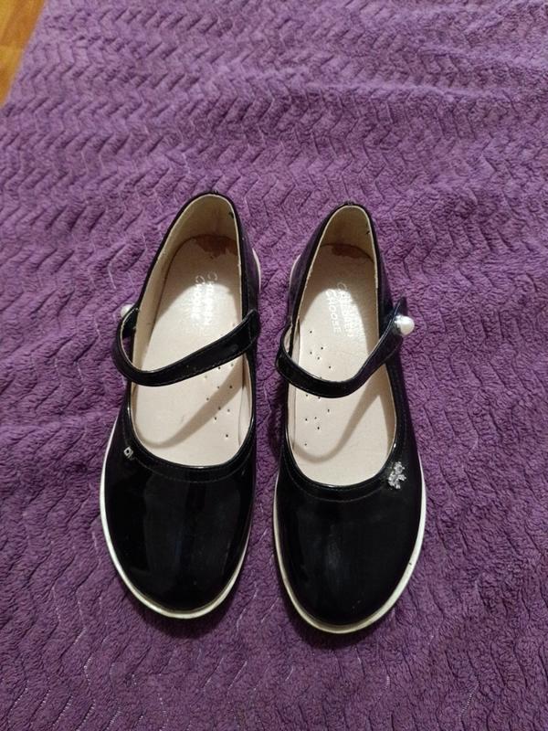 Туфли на среднюю ножку, на липучке. Из дефектов: потеряно бантик (украшение) на фото видно, и стелька немного облезла из-за попадания воды. Удобные и красиво смотрятся на ножке. Стелька приклеены.