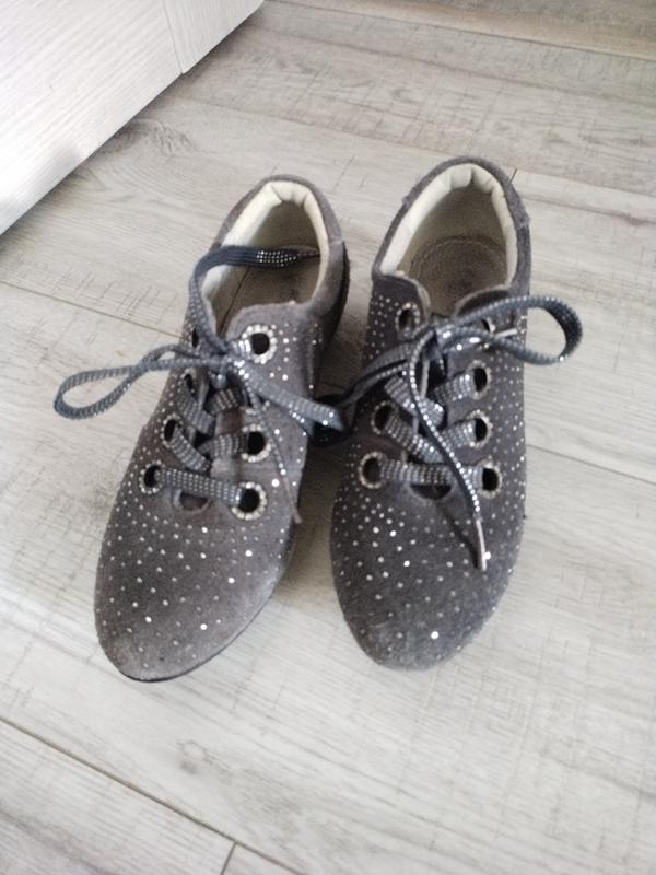Натуральный замш, украшенные стразами. Удобные. Быстро переросли. размер 33. Не узкие