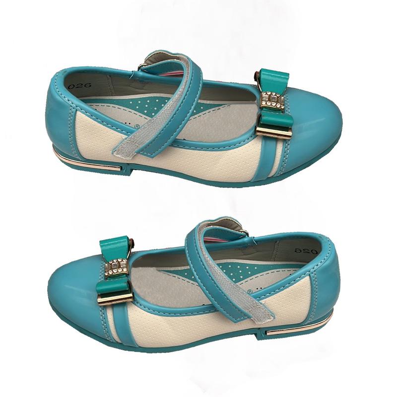 красиві туфельки з елегантним бантиком, він прикрашений стразами та металевими золотистими вставками, каблук також прикрашений металевою окантовкою, на ніжці фіксується перетинкою на липучці, анатомічна устілка з супінатором і перфорацією - натуральна шкіра, якісне виконання, туфлі виготовлені зі шкірозамінника, розміри 31-36