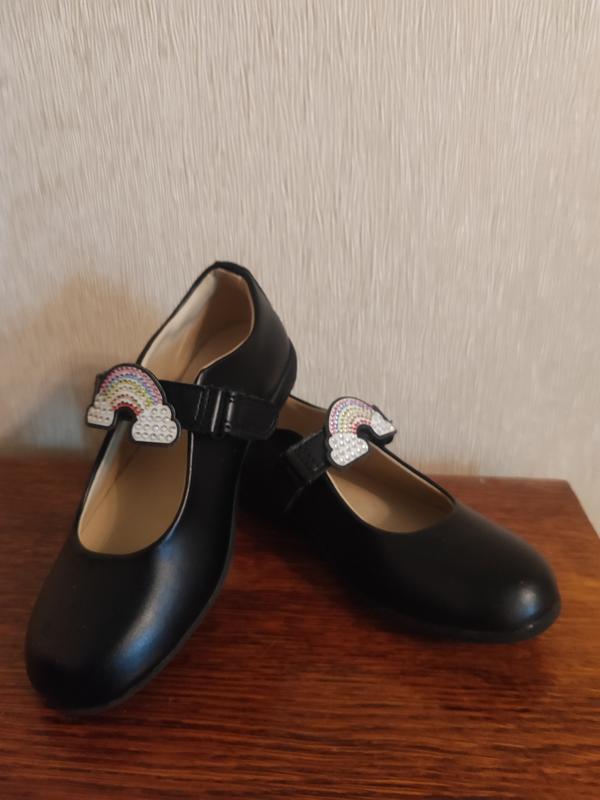 черные кожаные туфли для школы. застежка на декорированную, липучка фиксируется с обеих сторон, которую можно снять полностью. состояние идеальное, следов носки нет.