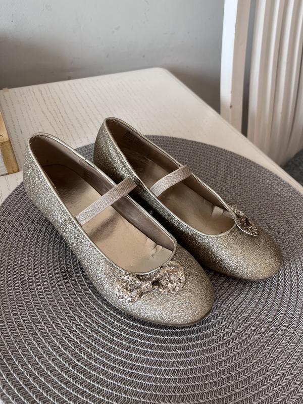 Продам золоті туфельки на невеличкому каблучку. На ніжку середньої повноти. Є резинка, щоб не спадали. Туфельки нові, не встигли поносити. По устілці 21 см