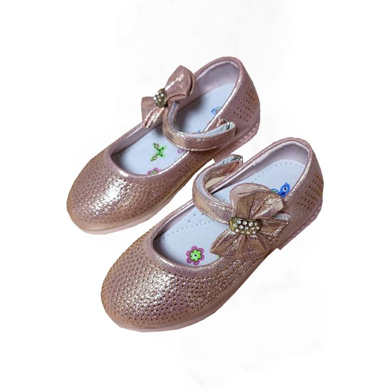 роскошные, нарядные туфельки с элегантным боковым бантиком, украшены россыпью страз по всей туфельки, они при ходьбе красиво переливаются, качественное исполнение, экокожа, легкие, на ножке фиксируется перепонкой на липучке, анатомическая стелька с супинатором и перфорацией - натуральная кожа, размеры: 22-26