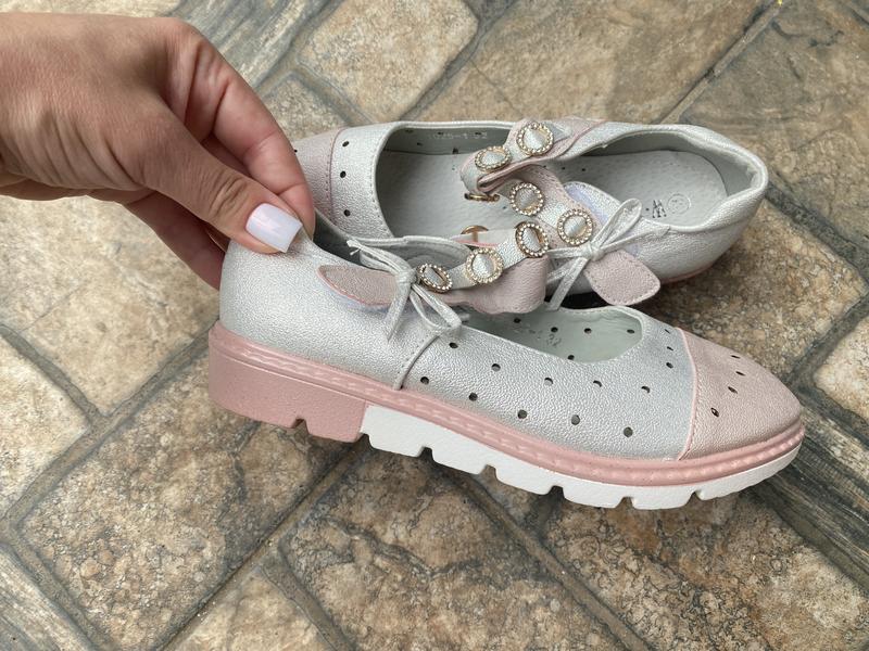 Новые нежные туфельки, стелька 19см, есть супинатор, стелька кожа, застежка на липучке, на солнце очень красиво переливаются.
