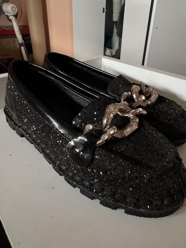 Стильные девчачьи туфельки, 36 размер, состояние идеальное, без каких-либо дефектов,. Цвет черный блестящий, декорированы объемной палочкой с камушками