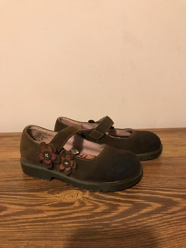Туфельки для дівчинки, замшеві з затемненим носком, на поліуретановій підошві,на липучці. темно коричневі,підійдуть на широку ножку. 18см устілка