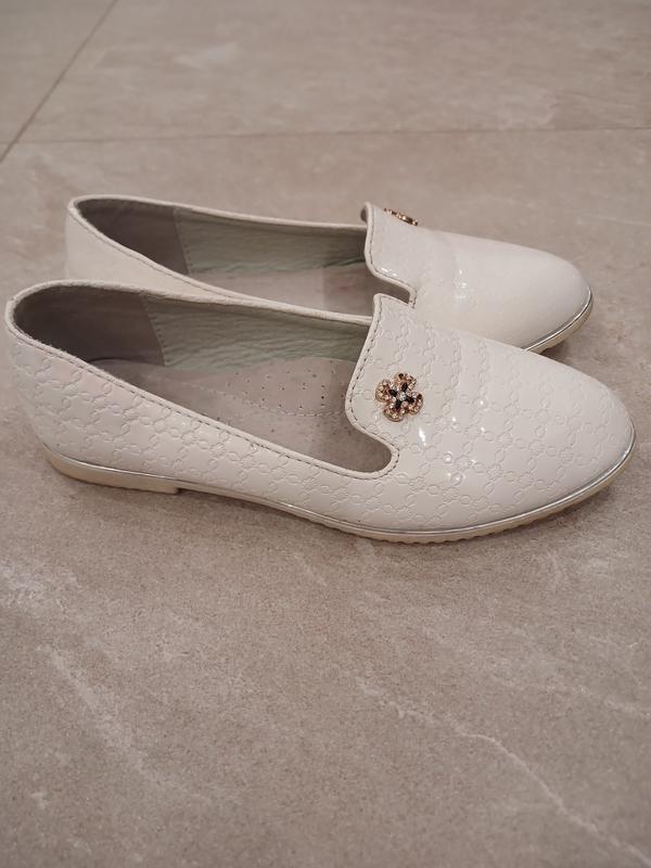беленькие туфли с сопинатором в середине. Подойдет ко всему гардеробу девочки.