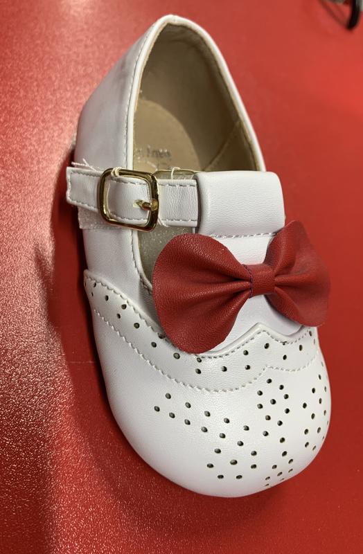 туфельки дівочі, в білому кольорі з червоним бантиком на маленькому підборі, застібаються на липучці, розмір 24. Елегантна ошатна модель підійде для маленьких модниць