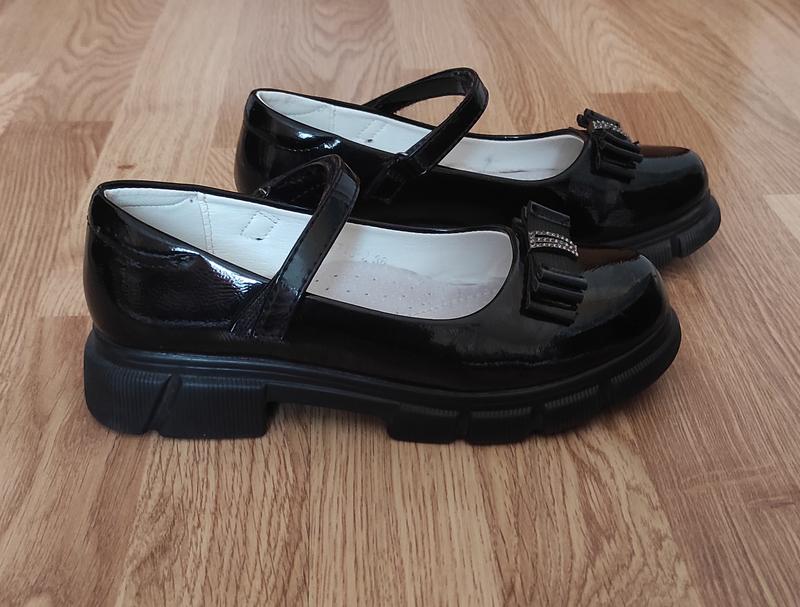 Очень красивые, стильные черные лакированные туфли 36 р. Стелька 22.7 см. Легкие. Наделись пару раз на праздники. Очень удобно наличие застежки на липучке - если туфельки крупноваты или ножка узенька, то не спадут.