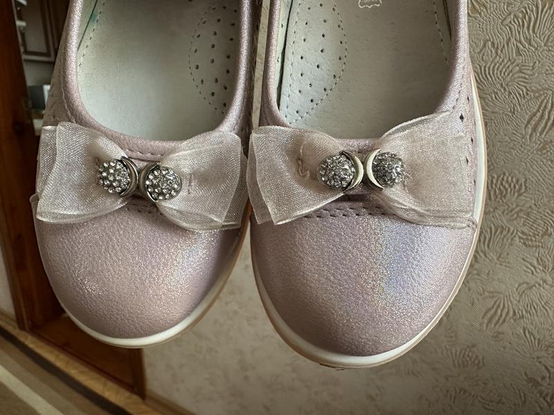 Туфельки в ідеальному стані. Адягнені 2 рази на свято. Носки без царапин, липучки -супер. Ніжно рожевого кольору, з переливом. Є фото де старалася показати, але фото не передає цих блискіток. На худеньку-середню ніжку. Довжина по устілці -20 см