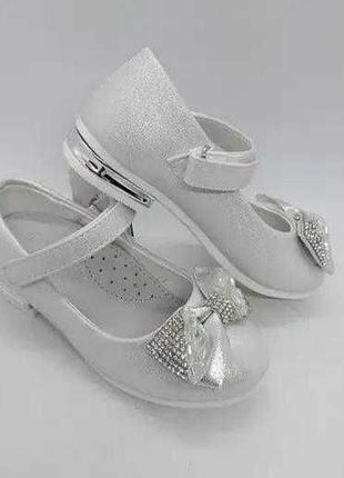 Отличные праздничные туфли для девочки! Выполнены из блестящего серебристого материала, украшены элегантными бантами с хрустальными камушками, придающими роскоши. Имеют удобную застежку на липучку, кожаную стельку с супинатором для комфорта и небольшой устойчивый каблук. Идеально подходят для торжественных событий: праздников, дня рождения, первого ПРИкосновения. Размер стельки 22,8 см Пишите на вайбер. Доставка и оплата Новой Поштой