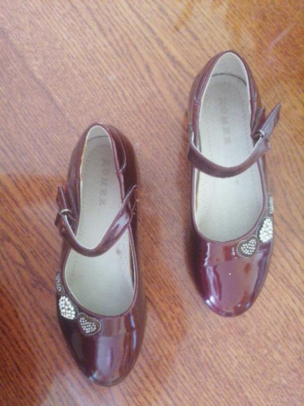 Качественные туфли для девочки в хорошем состоянии. Материал - лакированная экокожа. Длина стельки 19см. Высота каблука - 2см.