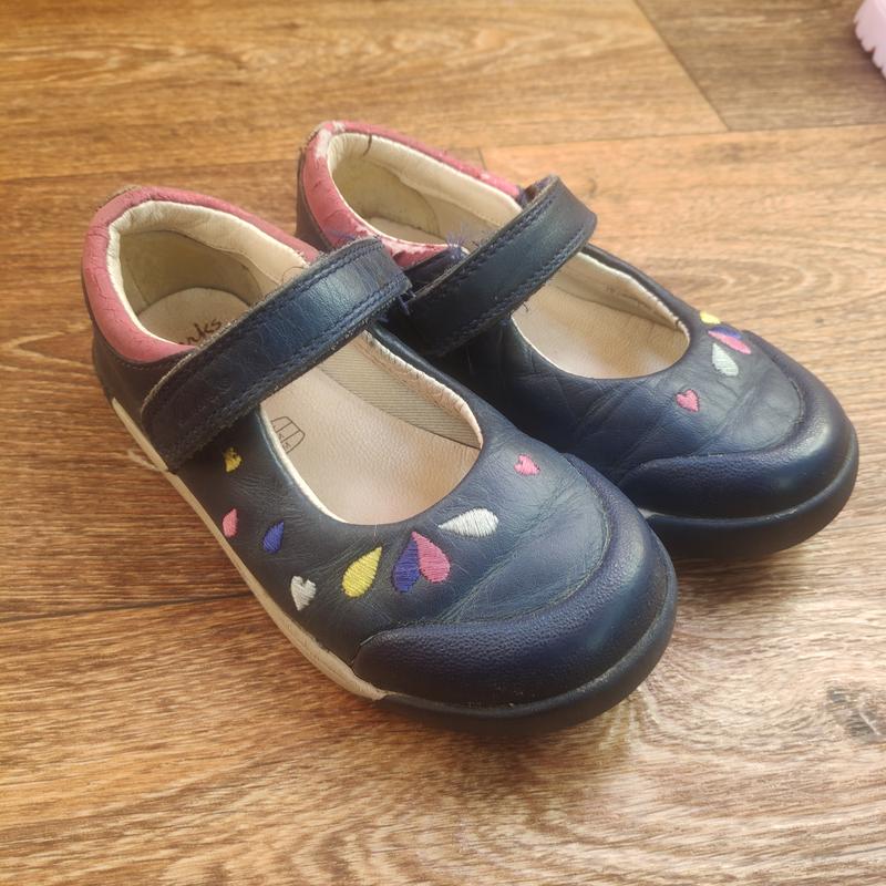 Туфельки Clarks для девочки. Сами ботиночки из кожи, но задники из кожзама, поэтому немного уже облезли. Красиво летом на влажную, но теплую погоду. Размер 26, стелька 16см. Цена символична.