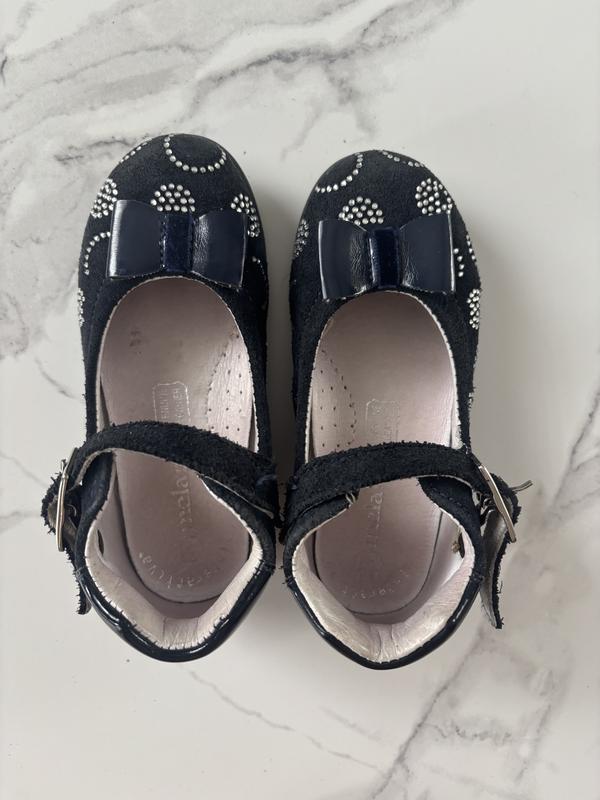 - Розмір: 24 - Стан: ідеальний - Матеріал: оксамитова тканина + лаковані вставки - Підошва: м’яка, комфортна - Декор: блискучі камінці, лакований бантик - Застібка: ремінець з пряжкою Дуже красиві й святкові туфельки. Пасуватимуть до сукні, штанців чи особливих подій. Вживу блищать і виглядають ще ніжніше. За потреби скину додаткові заміри