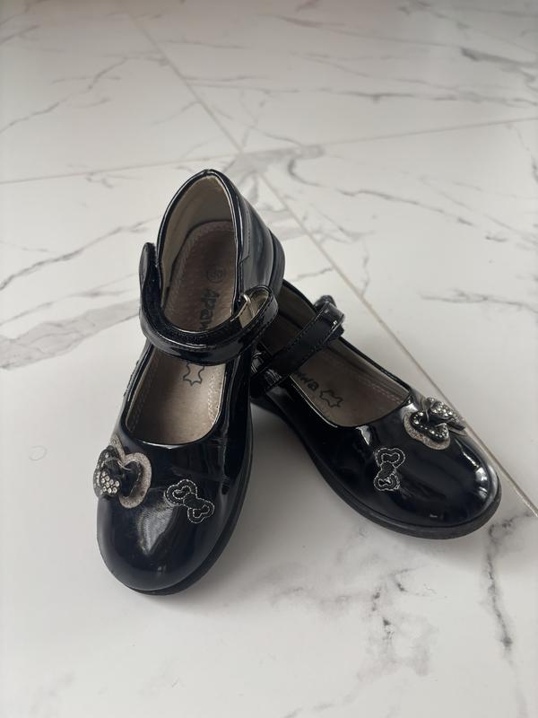 - Розмір: 30 - Стан: ідеальний - Матеріал: лакова еко-шкіра - Підошва: легка, зручна - Декор: блискучі бантики - Застібка: липучка Туфельки виглядають ошатно й гарно переливаються на світлі. Добре поєднуються з сукнями. За потреби скину додаткові заміри
