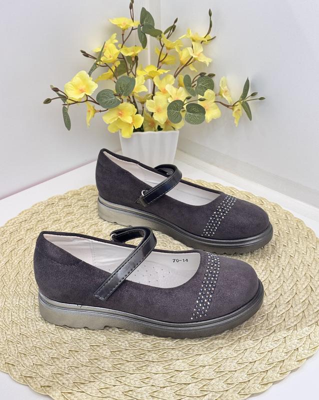 Гарні туфлі для дівчаток. Простий, стриманий дизайн. Зовні - екозамша, устілка шкіряна,з супінатором. Легко взуваються, фіксуються липучкою. 27 розмір- 17,8 см 29 розмір- 19 см 32 розмір- 20,5