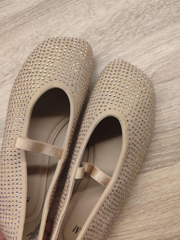 Балетки из ткани, украшенной стразами. Эластичный ремешок выше стопы. Подкладка из джерси. Стелька из технической пены CellfitTM для дополнительного комфорта. p. 30, p. 31, p. 32. бежевые.