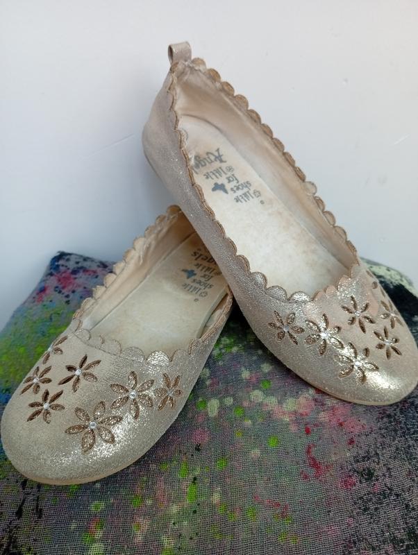 Продам туфельки б/у золотистого цвета. Стелька 18.5 см. Всё целое, кроме стёртой краски в некоторых местах , на фото отражено.