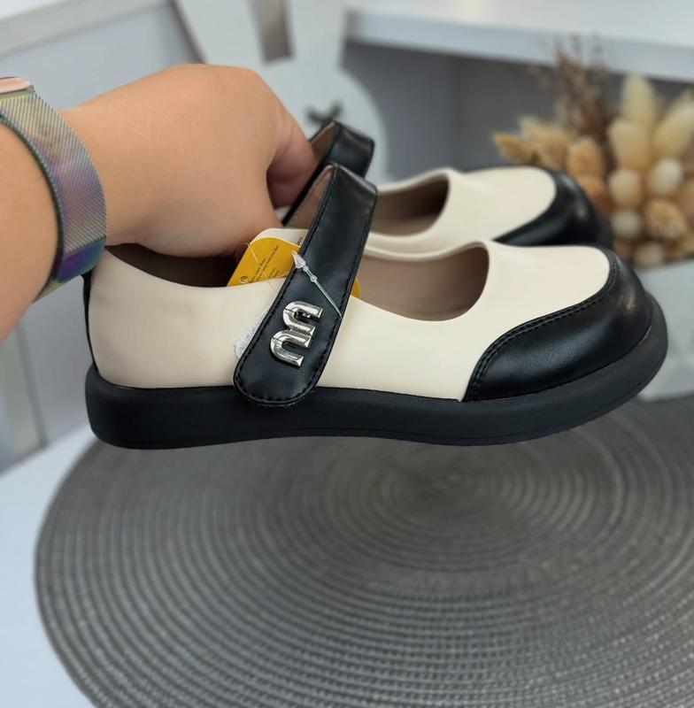 Класичні туфлі Clibee, бежеві з чорним, верх еко-шкіра, НЕ лаковані, устілка шкіряна з супінатором, мʼякенькі, та зручні, регулюються липучкою. 35-21,8 см