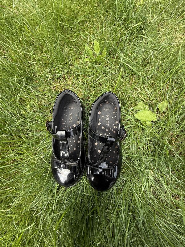 Лаковые туфли, идеальные для 1 сентября от бренд Next. Производитель отметил размер 12 g, что означает широкая посадка (высокий подъем ножки). Но они регулируются на застежке с сердечком. Имеют незначительные царапинки, на фото видно.