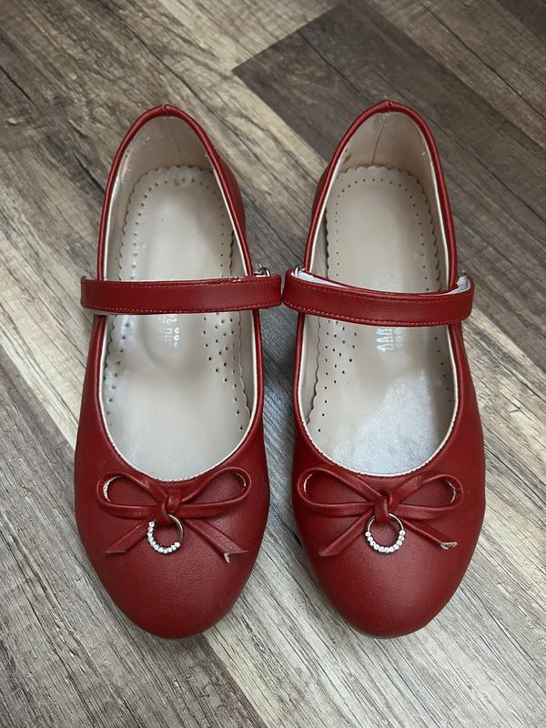 Червоні туфельки для дівчинки. Взувалися лише для виступу у залі. Тріщини збоку, непомітні на ніжці. Показала на фото