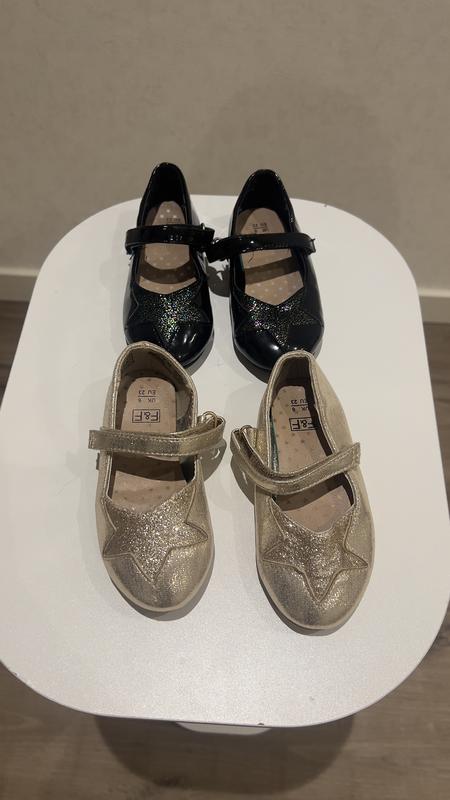 Фірмові дитячі туфлі від бренду F&F у новому стані. • Розмір: 23 (довжина устілки 13,5 см) • Колір: золотистий і чорний • Стан: новий • Застібка: липучка для зручного взування • Декор: блискітки та зіркові елементи Якісне взуття для особливих випадків та повсякденного носіння. Зручна посадка та надійна фіксація на нозі.