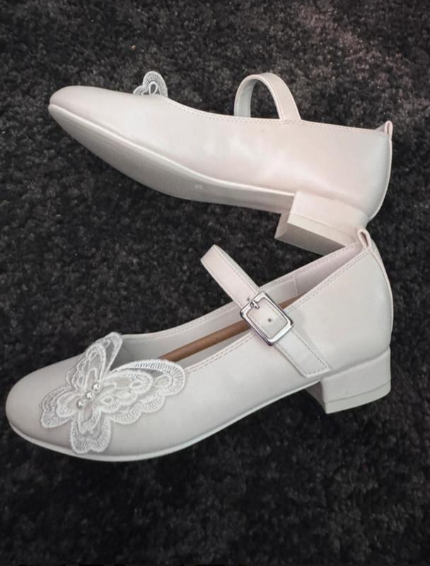 Белые праздничные туфли для девочки, Graceland, 36 размер, стелька 24 см. Нарядные туфельки с ремешком на пряжке, с невысоким устойчивым кольцом. Украшены большой кружевной аппликацией в форме бабочки. Хорошо подойдут девочке для любого празднования. Имеются небольшиепасть на каблуках ( фото 6). Ориентируйтесь на замеры стельки,фото есть в объявлении.