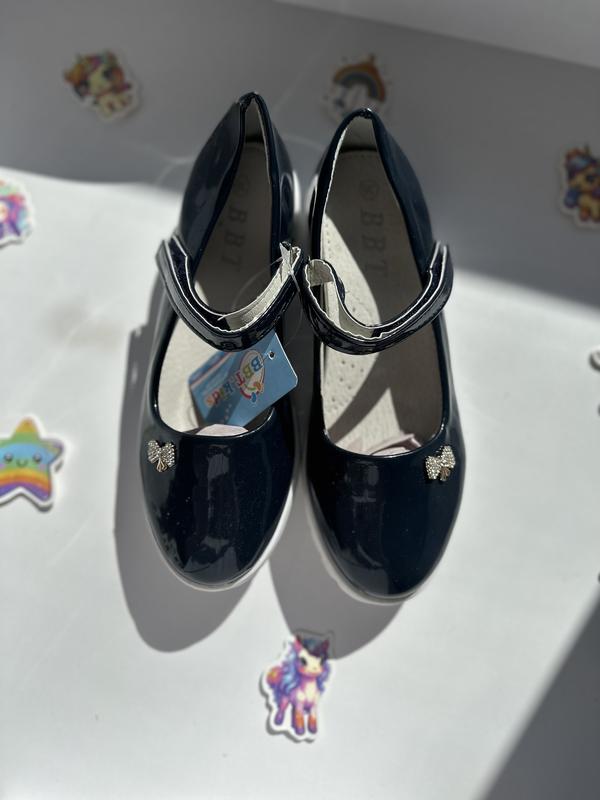 Красиві та акуратні дитячі туфельки темно-синього кольору. Лаковані, дуже ошатно виглядають на ніжці. Мають зручний ремінець для гарної фіксації та милий декор у вигляді бантика. Чудово підійдуть для садочка, свята, фотосесії, виступу або на кожен день.