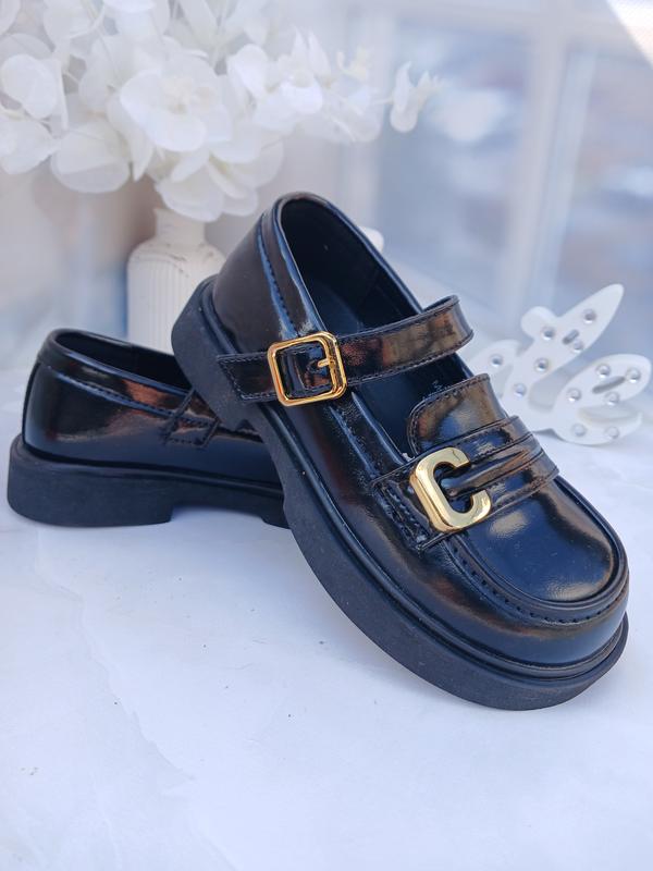 Стильные черные лофепы для девочек. Их часто выбирают, как школьную обувь. Данная модель отличается массивной подошвой и характерным декором в виде золотистой пряжки в форме буквы "С". Верх искусственная лакированная кожа. Стелька кожаная с супинатором. Туфли имеют удобную застежку-липучку, стилизованную под ремешок, что позволяет легко регулировать обувь по полноте ножки. Размеры в наличии: 27-17,5см 28-18,0см 29-18,5см 30-19,0см