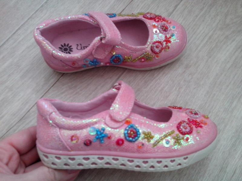 Красивые туфельки для девочки,цвет розовый,переливаются,новые,есть две пары -одна 15 см,другая -15.5 см,и ещё одни больше стелька 19.5 см.всего 3 пары . Есть такой момент- присутствует запах клея,в остальном всё отлично- очень красивые!