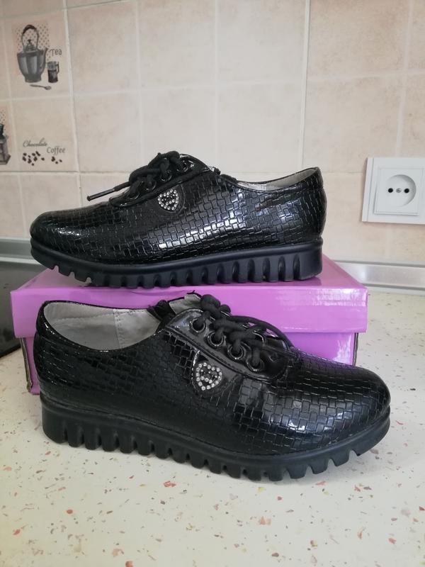 Туфли черные лаковые для девочки размер 31 по стельке 19,8 см стелька кожаная с боку на замочке шнуровка декоративная, можно не развязывать состяние отличное