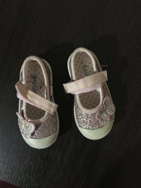 Очень милые туфельки для такой же миленькой девочки;) немножко отошёл блеск в одном месте. Показала на фото.