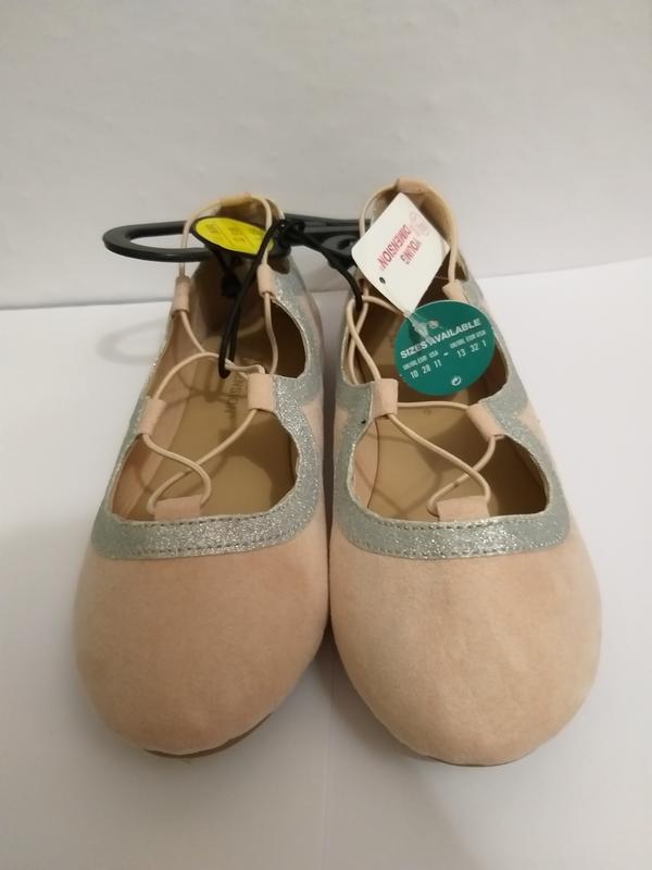 Размер: 32 (длина стельки 20 см) Балетки бежевого цвета с сребристой окантовкой, верх текстиль (иск. замш), стелька экокожа. На ноге фиксируются плетением из резинки. Легкие и удобные, отличный вариант для повседневной носки. Без торга!