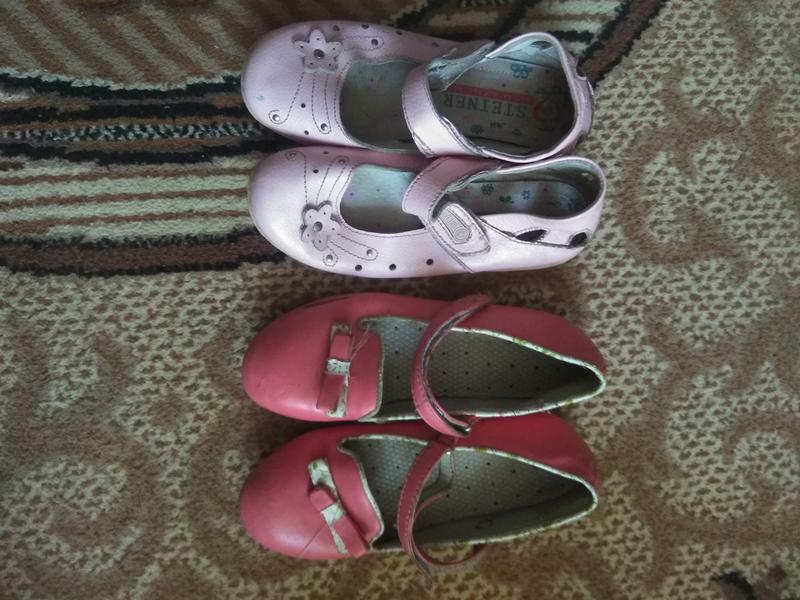 Розовые состояние очень хорошее, нюанс на фото 4, фото 5 надо чуть зашить липучку, сами липучки держат хорошо. По стельке где-то 19-19,5см. Покупали как кожаные. Светло коралловые состояние удовлетворительное, для дома и двора, дыр нет, только потёртости, липучки хорошие. По стельке где-то 19,5-20см. Если покупать две пары отдам за 60грн.