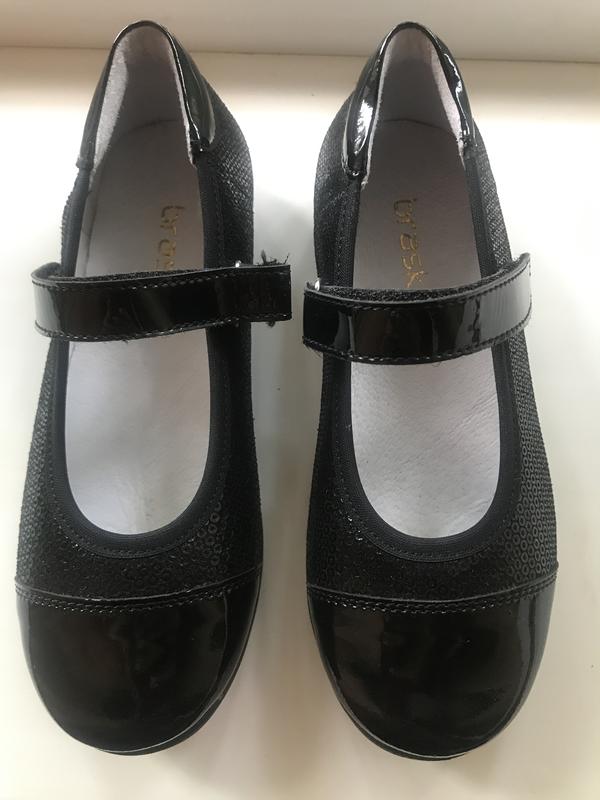 Туфлі для дівчинки Braska чорного кольору. Шкіряні, оздоблені чорними паєтками, з лаковим носком та липучкою. Чудово підійдуть для школи. Абсолютно нові, ми прогадали з розміром. Взували лише в квартирі {підошва на фото} 31-й розмір, довжина по устілці-18 см