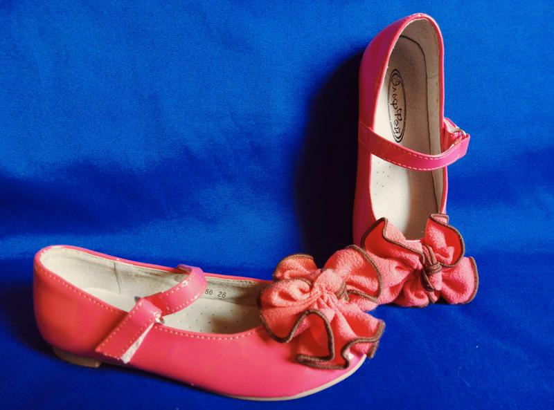 --Красивые туфельки фирмы ЭльфФей в новом состоянии. --Обуты 4 раза на праздники в сад. Носы не сбиты, не стоптаны, стелька-чистая. --Размер 26-27, длина по стельке 17 см. --Цвет-кораловый, как на фото. --Вверх-лакированный кожзам, стелька-кожаная с супинатором. Застежка-липучка. --Эффектные туфельки для девочки. Перешлю Укр и Новой почтой. Для киевлян возможна встреча с примеркой по договоренности.