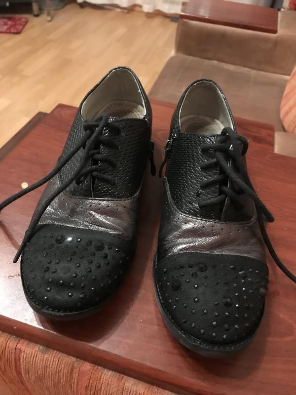 Туфлі в школу,на замочку,зручно одягати дитині,стан в цілому хороший,єдине на передках кілька камінчиків відпало,в шкарпетці не помітно взагалі,розмір 35,по устілці до 22 см