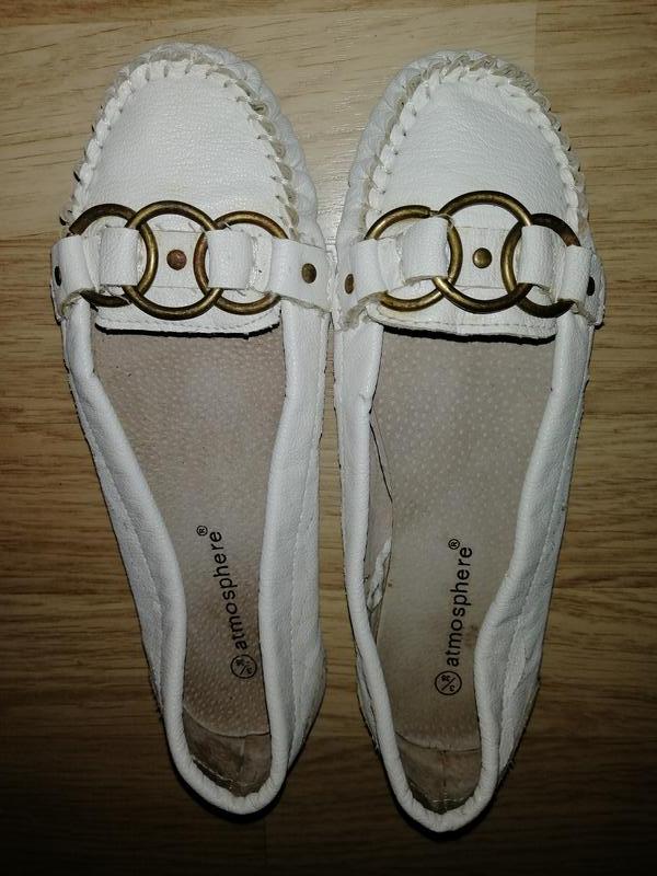Мокасины белые для девочки Atmosphere, размер 34-35, стелька - 22 см. Верх- кожзам. очень качественный, плотный. От натуральной кожи не отличишь. Внутри стелька натуральная. Легкие, удобные. Состояние идеальное.