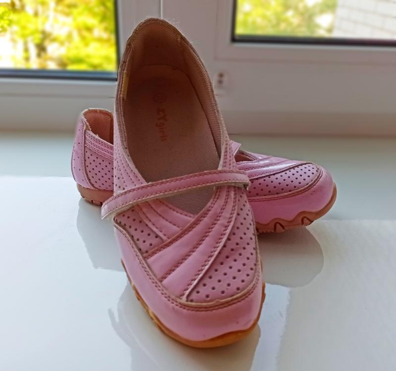 Милі і зручні світло-рожеві туфлі для дівчинки. Дуже зручні і легкі. В носці майже не були, хоча від часу трошки пожовкла підошва. Трошки збитий передок. Є лаковані елементи, що додає туфелькам святковості. Довжина устілки 23 см. Краще підійде на не дуже вузеньку ніжку.
