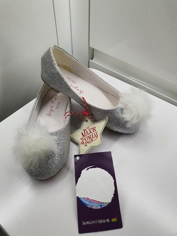 Ошатні блискучі балетки для дівчаток. На середньої повноти або вузьку ногу. З хутряним помпоном спереду. Склад: всередині PU. Без дефектів. Довжина устілки: 16.5 див. Оплата на карту Приват банку і доставка новою поштою.