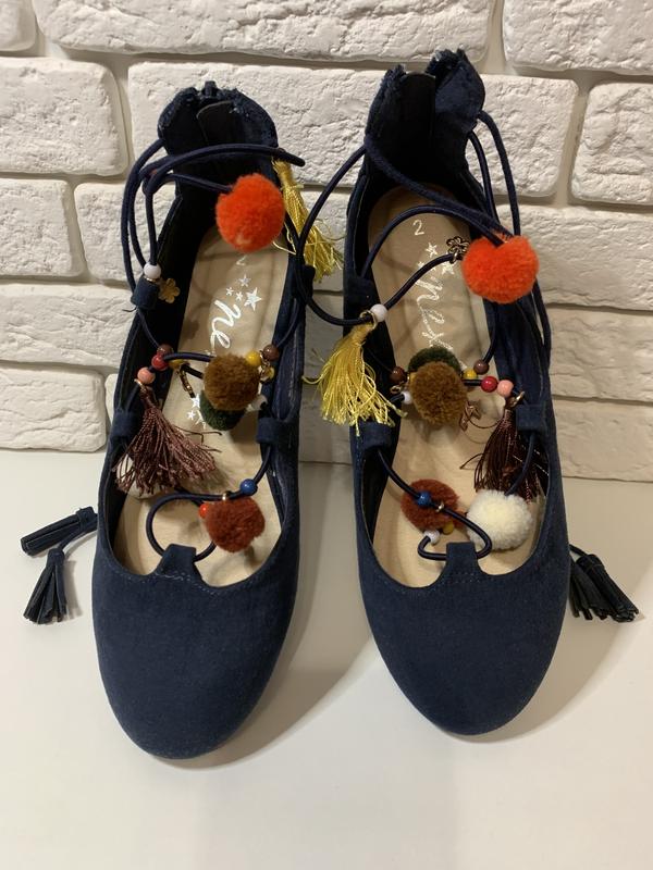 Шикарные туфельки синего цвета которые подойдут под любой наряд ) Состояние новых , 33р Сверху идут по ножке завязки ! Фирма Next