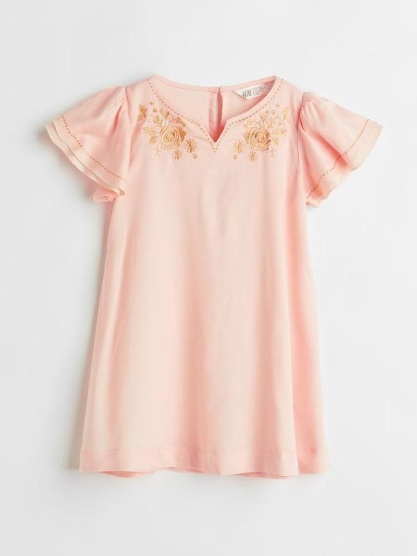 Туника из плетеной ткани с мерцающими золотистыми вышитыми деталями вверху и на рукавах. Небольшой V-образный вырез спереди, пуговица сзади и двухслойные рукава-ветрески с декоративными складками на плечах. Без подкладки.