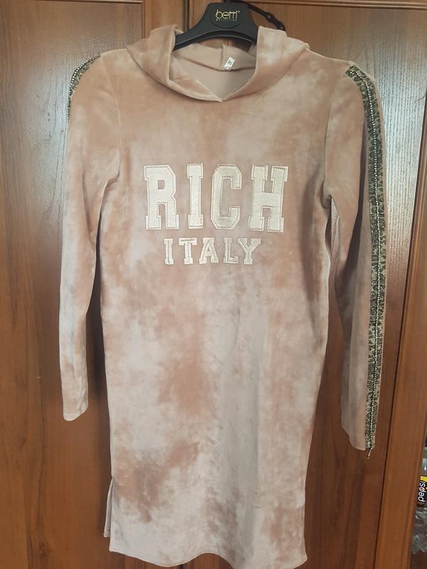 Праздничное велюровое платье-худи RICH Italy Стильное и уютное платье из мягкого велюра, идеальное для зимних и новогодних образов. Нежный пудровый цвет, аккуратная надпись RICH ITALY, декоративные элементы на рукавах. Комфортная, теплая и очень приятная к телу. Замеры (см): • ширина плеч - 36 • длина плеча - 8 • длина рукава - 54 • ширина под подмышками - 40 • длина изделия - 85 Состояние: идеальное, без дефектов. Отличный вариант для ежедневных образов.