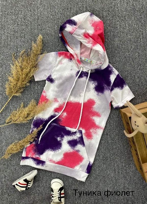 Стильна літня туніка з капюшоном та кишенею кенгуру. Стрейт трикотаж Розміри: 110 – довж 58 / пог 32 116 – довж61/ пог 33 122 -довж 62 / пог 34 128 -довж 63 / пог 35 134 -довж 65 / пог 37 140 – довж 66 / пог 38