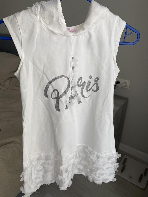 Белое платье-туника choupette Paris. Хорошее состояние с капюшоном. На 8-10 лет. Плечи 28,5 Длина 63 Грудь(от подмышки до подмышки) 35