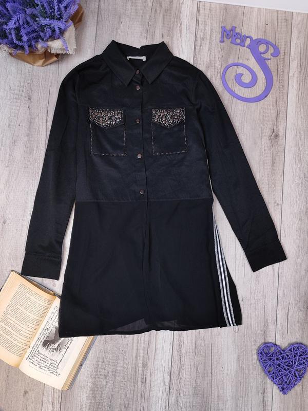 Туника для девочки Lucky Talin с длинным рукавом чёрная. Застежка от горловины до талии на пуговицы, ниже разрез спереди. Воротник рубашечный. На груди два кармана, декорированы стразами и металлическими бусинами. Состояние б/у, в отличном состоянии Производитель Lucky Talin Размер 140-146 (10-11 лет) Цвет черный Состав 70% вискоза, 25% полиамид, 5% эластан Замеры: Полуобхват груди 41 см Полуобхват талии 41 см Длина 76 см Длина рукава 58 см Ширина по плечам 35 см