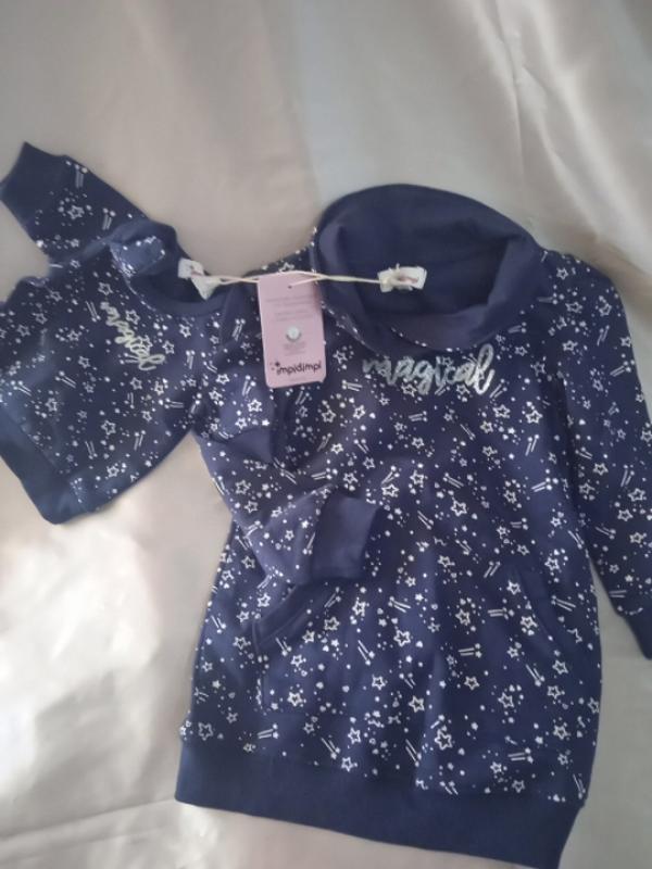 Теплое хлопковое трикотажное на байке. платье-туника с карманом "кенгуру" для девочки, р.98 и кофточка для ее куклы. Платье: ширина плеч 27см, ширина по груди 30см, ширина по низу 29-33см, длина рукава 33см, длина по спинке 44,5см. Кофточка: ширина плеч 14,5см, ширина по груди 19см, длина по спинке 21,5см, длина рукава 11,5см