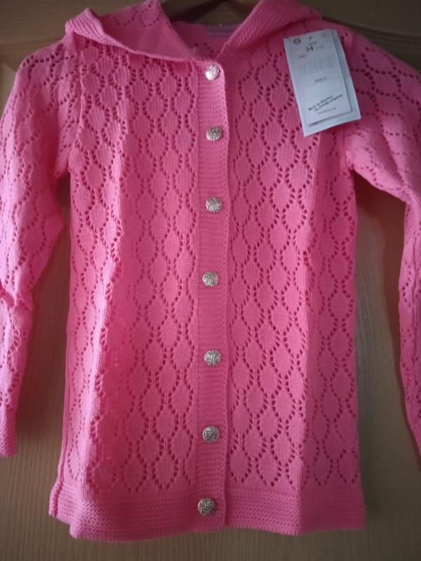 Туника для девочки с капюшоном выполнена вязкой "ажур". Застежка - пуговицы к низу изделия. Состав изделия 70%-влаго, 30% нитрон. Производство м. Харьков, ТАШКАН.