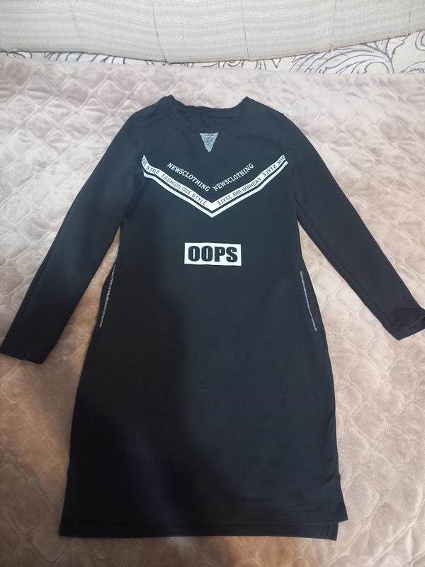 Платье -туника трикотажное черное, употребленное, в красивом состоянии на девочку 9-10роков, Длина рукава 47 см, длина изделия 74см.